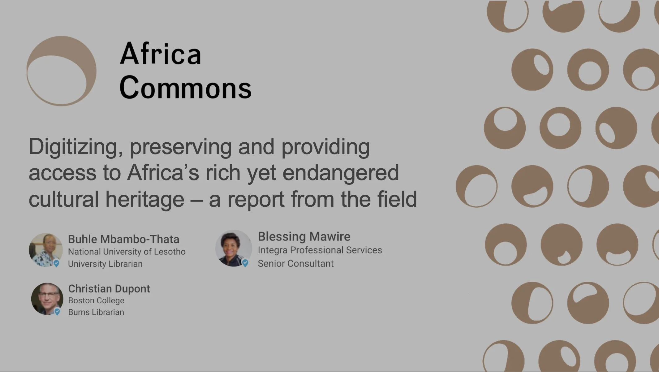 Dr. Mbambo-Thata, Ms. Mawire, and Mr. Dupont discuss the challenges of digitization in Africa, the results of a recently conducted survey of African archives, and how Africa Commons will help. This presentation was recorded at the 2021 Charleston Conference.
